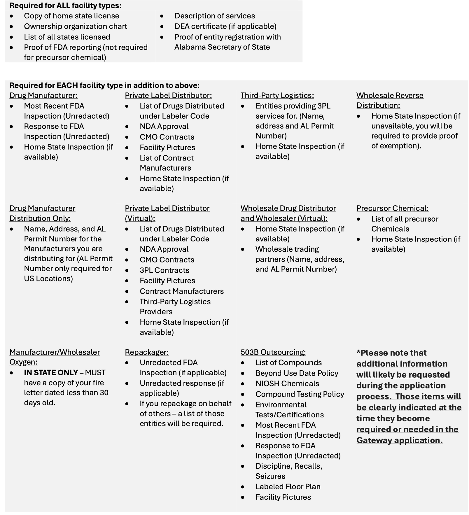 The Alabama Board of Pharmacy issues the following types of business permits. Click on which business pertains to you for more information. Please note that all Alabama Board of Pharmacy permits are operational-specific. Please read the definitions of each facility type before making your selection.